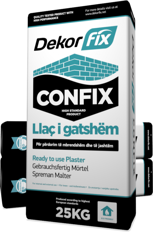 Confix është llaç i gatshëm pluhur, i parapërgatitur për përdorimme bazë çimenton dhe gëlqerën. Duhet vetëm ti shtohet uji. Është ideal për suvatimin e mureve të brendshme dhe të jashtme me trashësi 2.5 cm, për tavane si dhe për të gjitha llojet e bazamenteve.